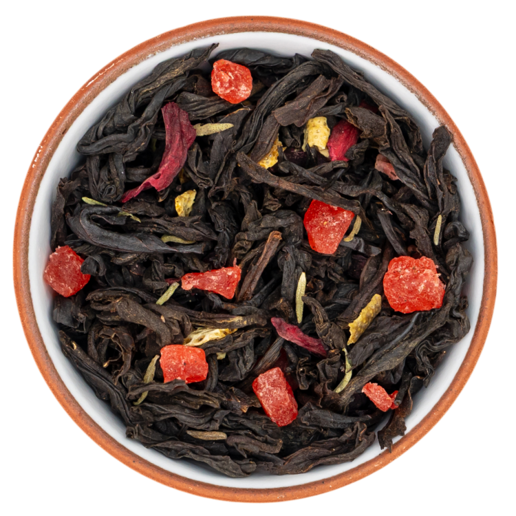 Состав Черный чай Ассам, каркаде, цукаты ананаса, ягоды клубники, чабрец, цедра апельсина, ароматизатор |